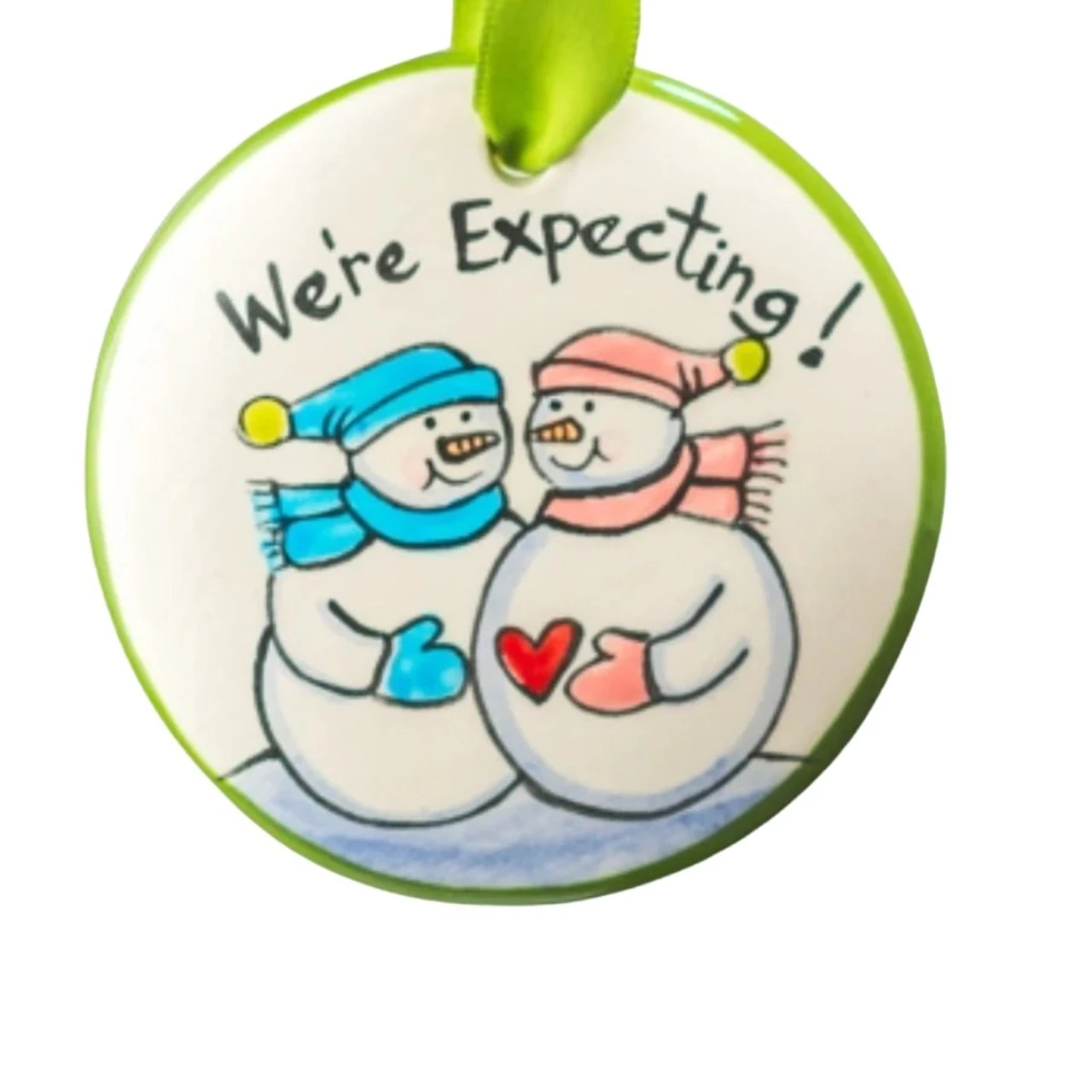 Celebrate life’s sweetest surprise with the Nola Watkins We’re Expecting Ornament, hand-painted in Halifax, VA. This cheerful ceramic disk features two smiling snow parents-to-be with colorful scarves and mitten hearts, alongside the joyful phrase “We’re Expecting!”