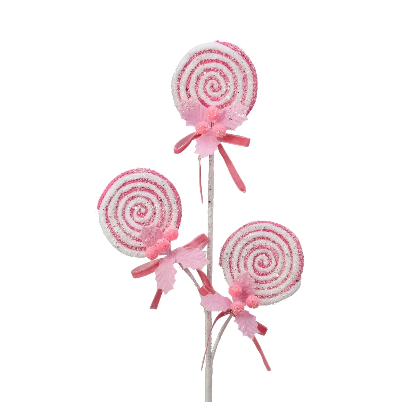 Add a sweet touch to your holiday decor with this 25″ Pink Lollipop w/Pompom Holly Spray. This whimsical spray features three swirling pink lollipops adorned with glitter, pom-poms, and delicate holly leaves.