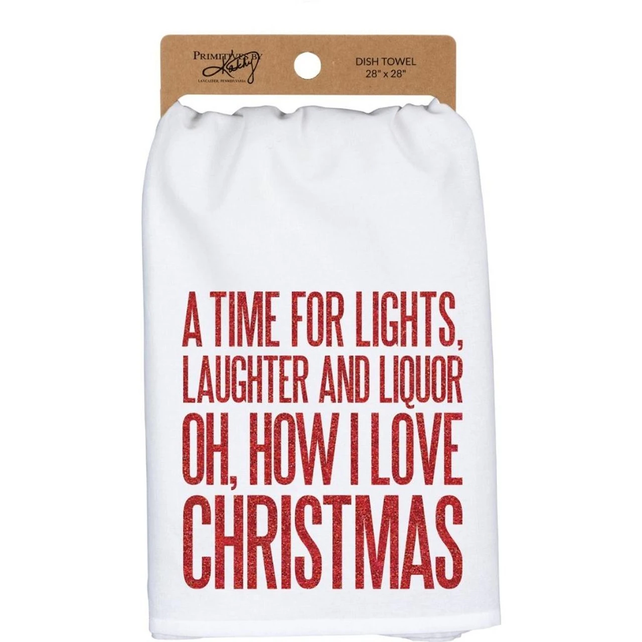 A cotton kitchen towel featuring “A Time For Lights, Laughter And Liquor. Oh, How I Love Christmas” sentiment in box sign style with rich-pigmented glitter accents for the ultimate Christmas kitchen decor. The towel is machine-washable and glitter will not transfer. The towel is packaged on a cardboard hanger with a hole to easily hang on a rack.