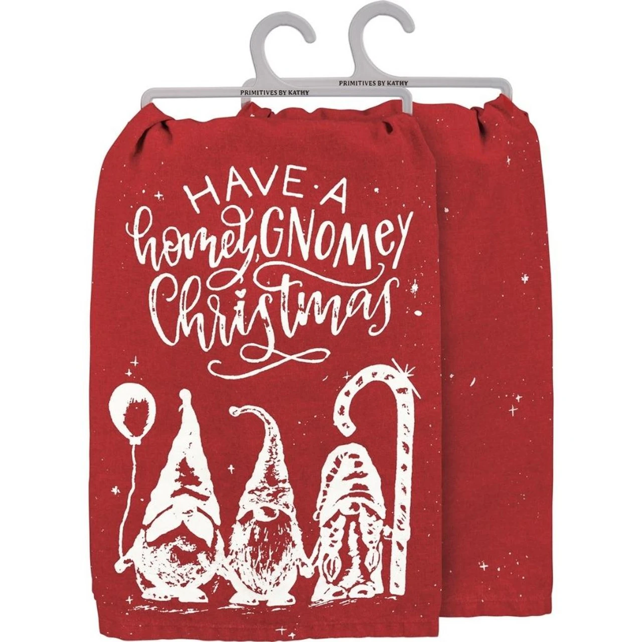 A red cotton kitchen towel featuring a gnome design with a “Have A Homey Gnomey Christmas” sentiment. Machine-washable.