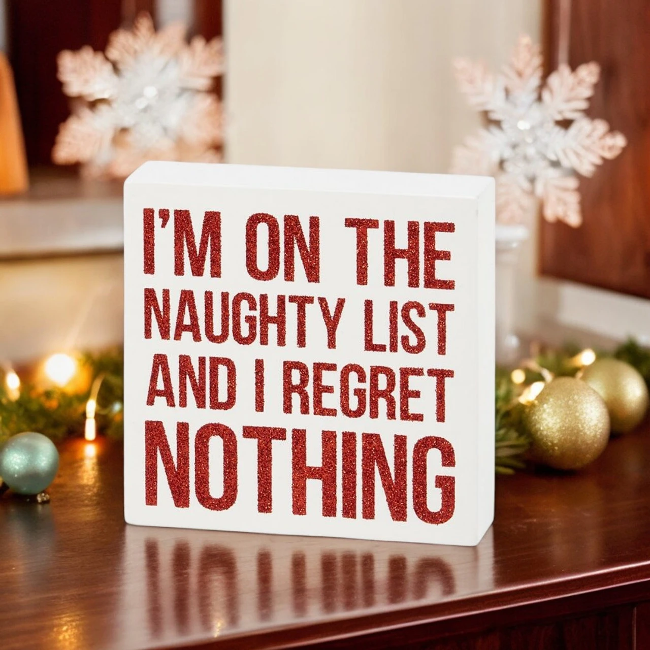 Celebrate your mischievous side with this “I’m on the Naughty List and I Regret Nothing” block sign. Featuring bold, glittery red letters on a white background, this playful sign is perfect for adding a touch of humor to your holiday decor.