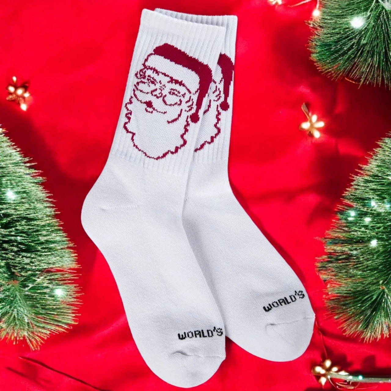 Celebrate the holidays with the Santa Claus Sport Mini Crew Socks! These sporty socks feature a classic Santa face in red on a crisp white background, adding a subtle festive touch to your athletic look.