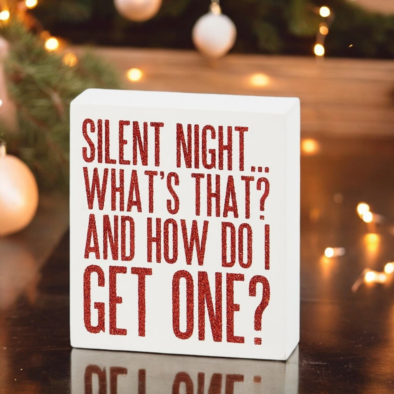 Add a touch of holiday humor to your home with this “Silent Night…What’s That? And How Do I Get One?” block sign. Featuring glittery red letters on a white background, this fun and festive sign is perfect for anyone who loves a good laugh.
