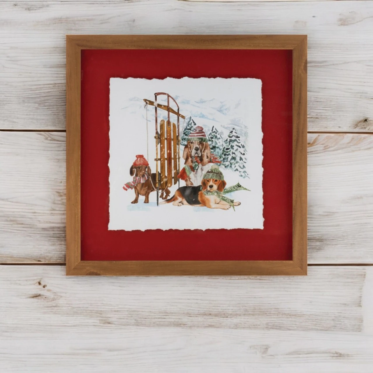 Crafted from plastic, canvas, and glass, this charming artwork is framed for easy display. Perfect for dog lovers and holiday enthusiasts, the playful design will bring festive joy to any room during the holiday season.