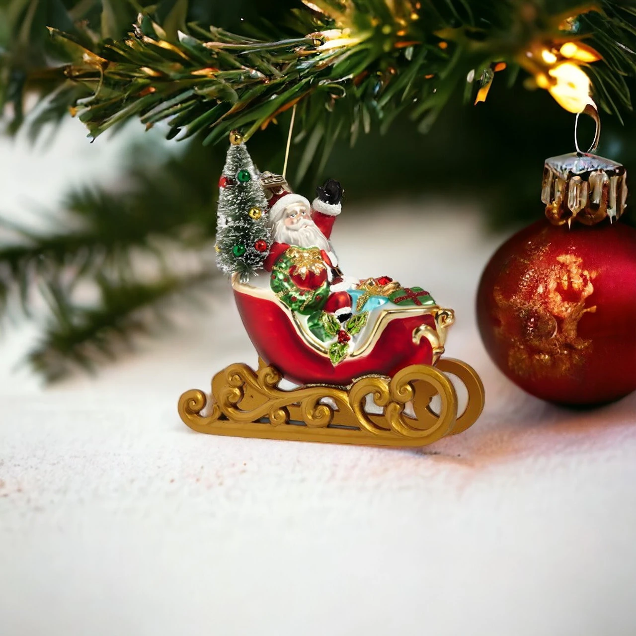 Experience the joy of the holiday season with this 5.25″ Sleigh Ride Ornament. Featuring Santa Claus cheerfully waving from his festive sleigh, packed with gifts and a decorated Christmas tree, this ornament captures the spirit of Christmas.