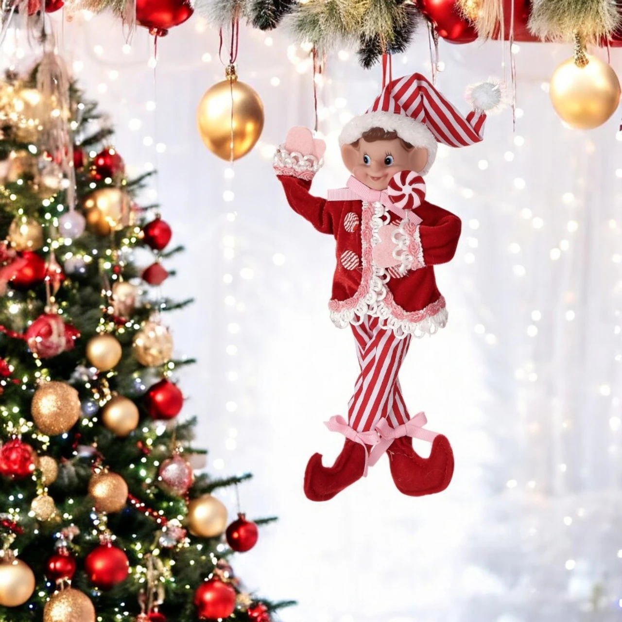 Add a sprinkle of sweetness to your holiday decor with this 11″ Small Fabric Red Sweets Pixie Elf Ornament. Dressed in a delightful candy-inspired outfit, complete with peppermint buttons and candy cane-striped leggings, this adorable pixie elf is ready to spread cheer.