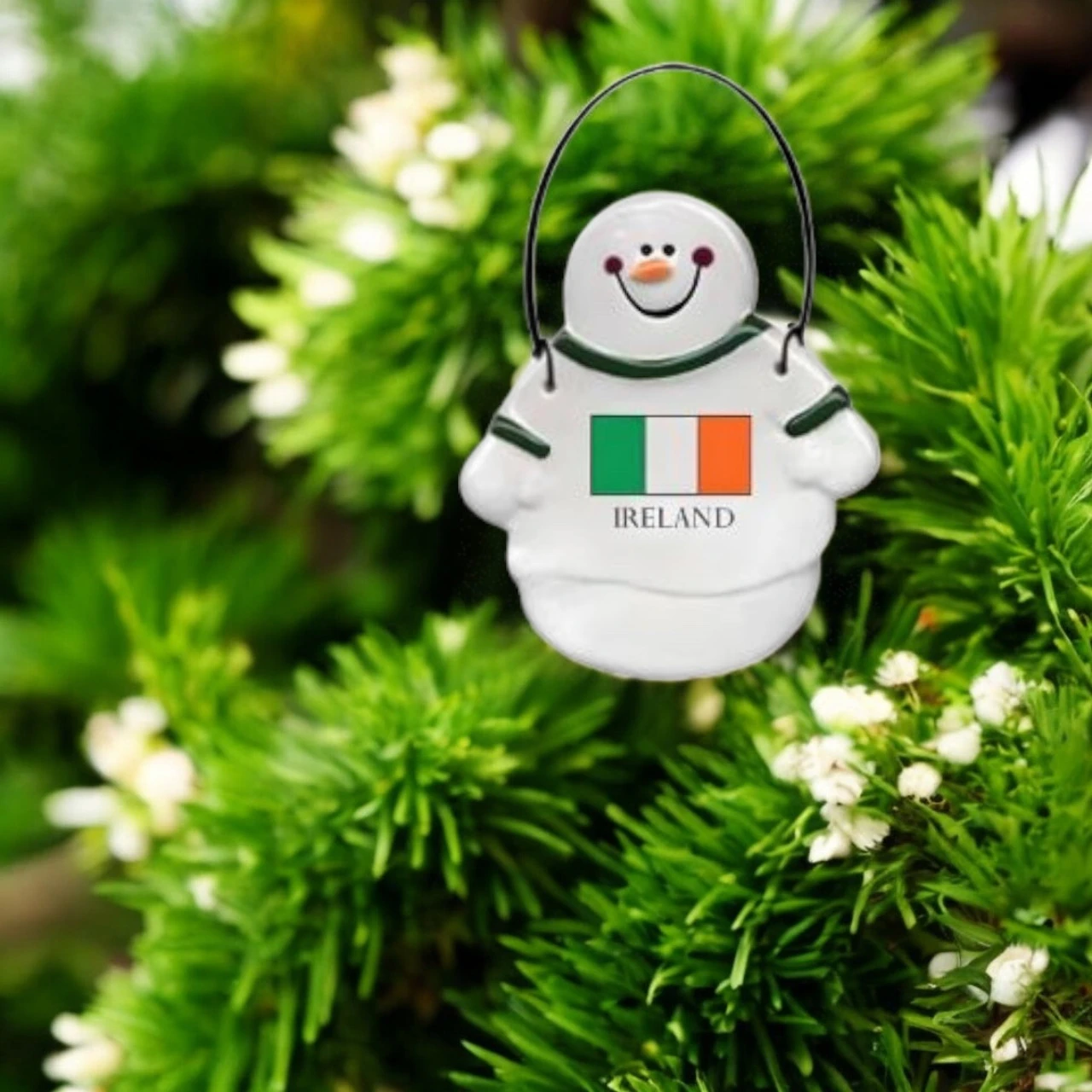 Add a touch of Irish charm to your Christmas tree with this delightful Snowman with Ireland Flag Ornament! Featuring a cheerful ceramic snowman wearing a T-shirt with the Irish flag, this ornament is perfect for celebrating the holiday season with a bit of Emerald Isle pride.
