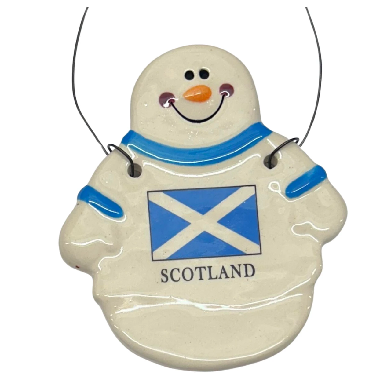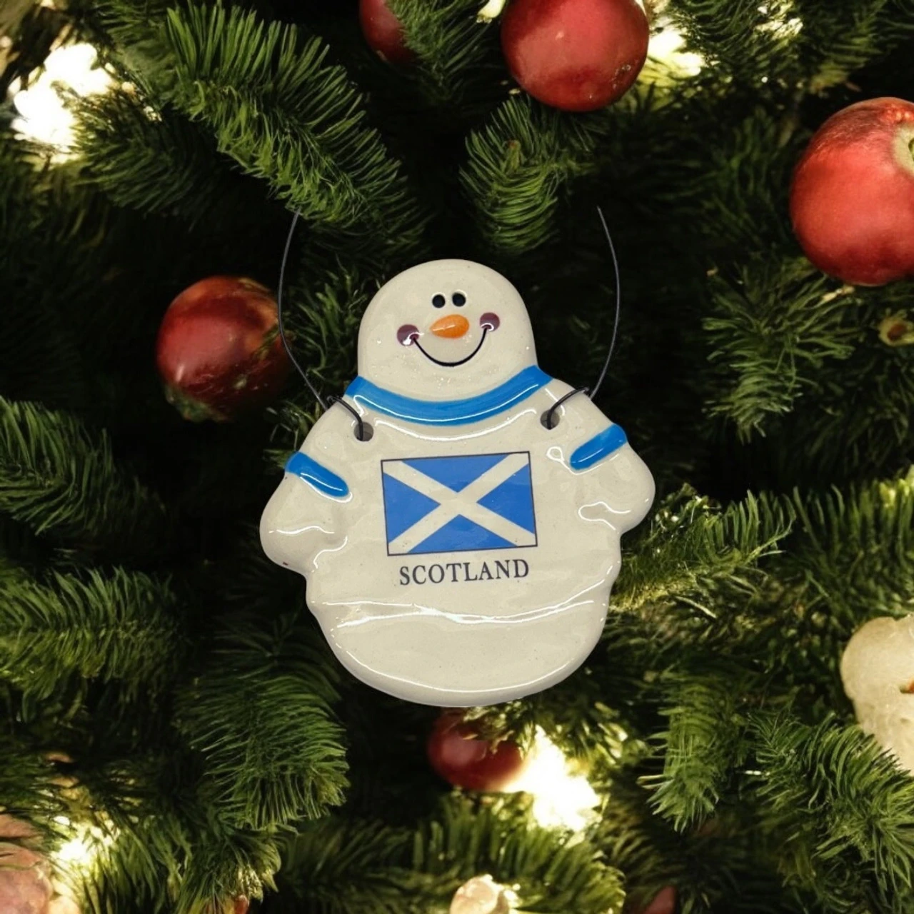Celebrate your Scottish heritage this holiday season with the Snowman with Scotland Flag Ornament! This delightful ceramic snowman proudly displays the Scottish flag on his T-shirt, making it the perfect festive addition to your Christmas tree.