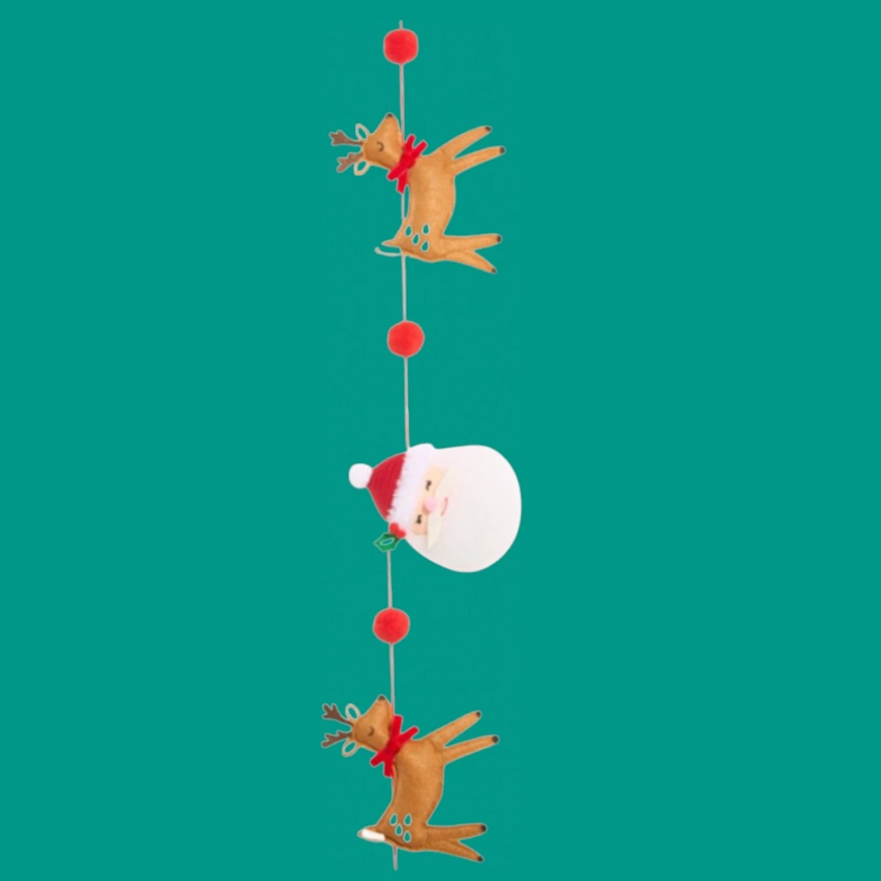 Add festive charm to your décor with the Spirited Melody Santa & Reindeer Felt Garland! This whimsical garland features Santa’s cheerful face, prancing reindeer, and fluffy red pom-poms strung along a sturdy thread.