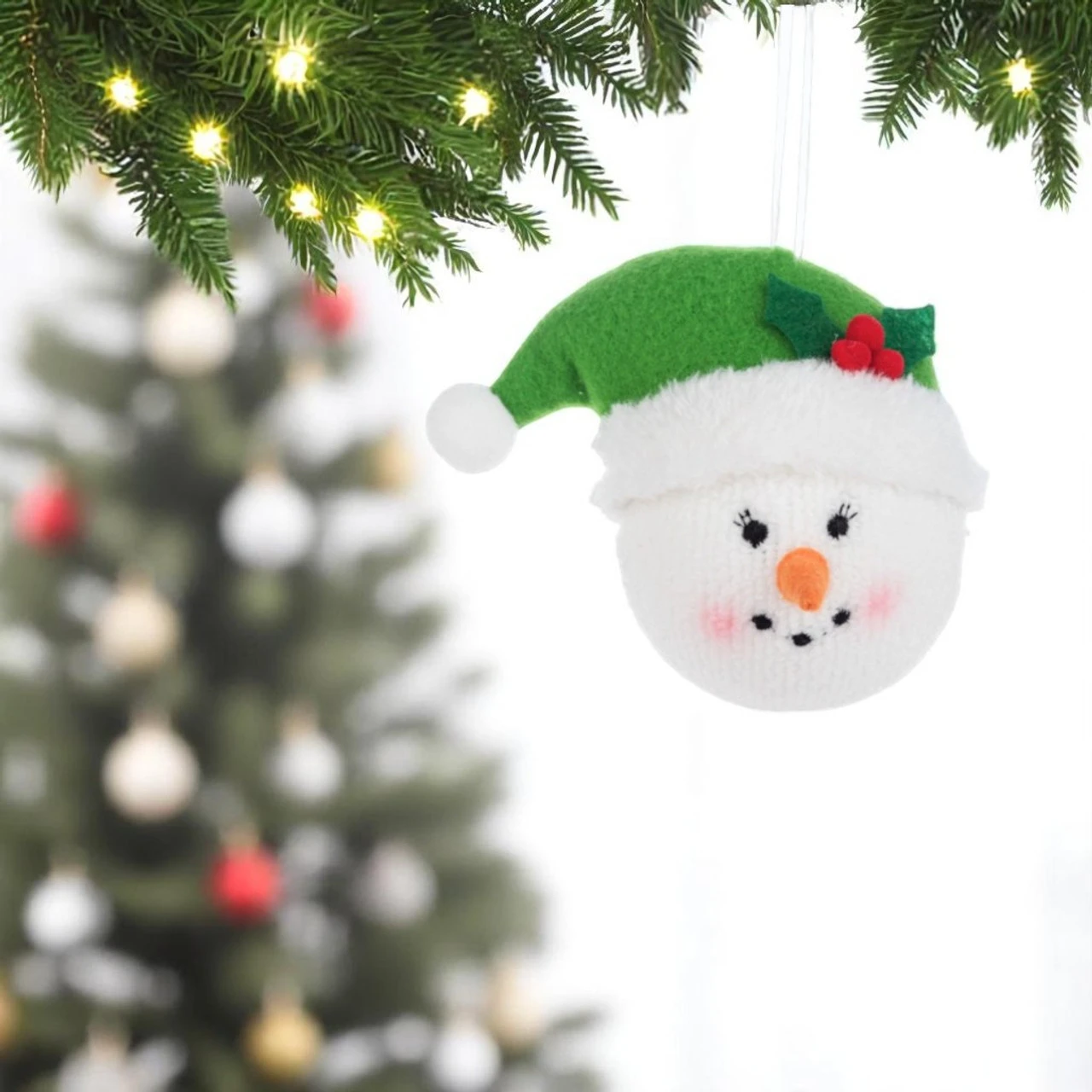Add a touch of frosty fun to your tree with our Stuffed Snowman Green Hat Ornament! This adorable 3-inch snowman features a bright carrot nose, stitched smile, and rosy cheeks, all topped with a festive green hat trimmed with holly.