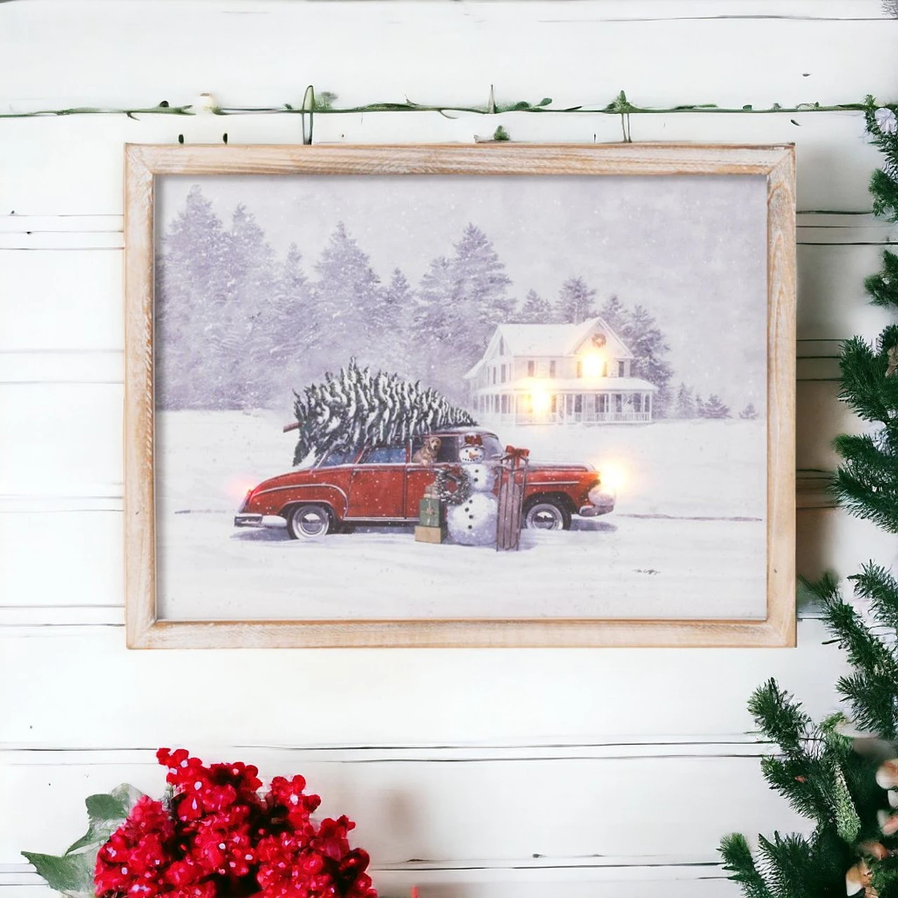 Capture the essence of a nostalgic winter wonderland with our 15.5 inch Lighted Car Print. A classic red car, snowy homestead, and a cheerful snowman bring the magic of the holidays to your space. The soft, warm glow from the car’s headlights and the home’s windows creates a cozy atmosphere.