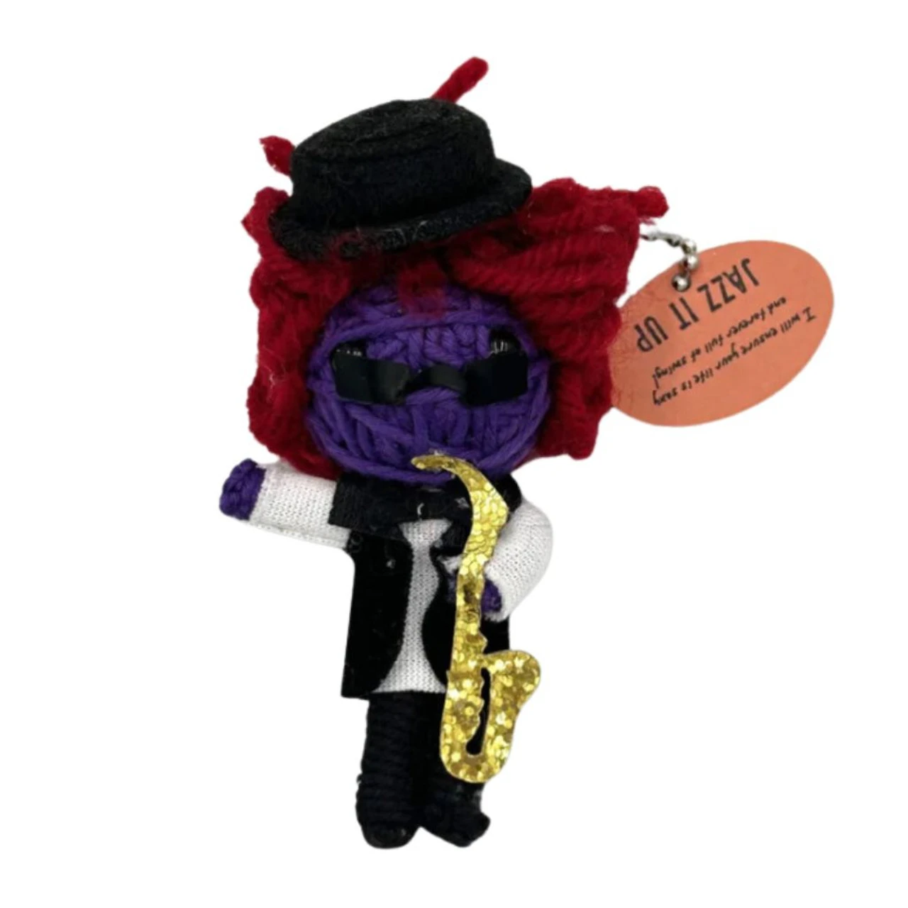 Swing into action with the Jazz It Up Voodoo Doll! This vibrant charm from the NOLA Collection features a purple figure rocking a stylish black hat, bold red hair, and a glittery saxophone.
