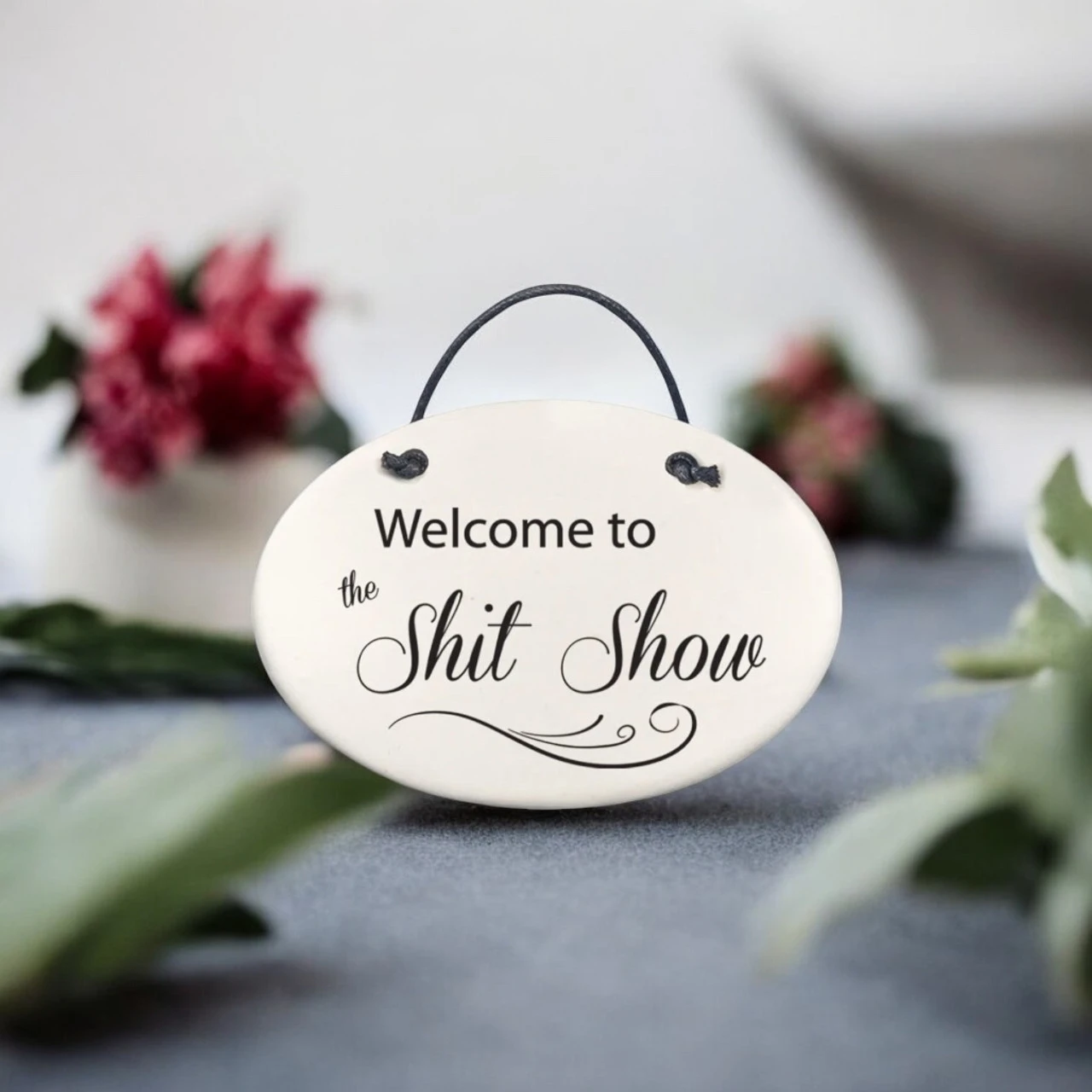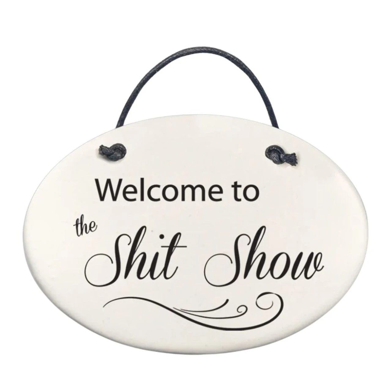 Welcome your guests with humor and charm with the Welcome to the Shit Show Ceramic Wall Plaque! This oval-shaped sign features elegant scroll text and a playful message, perfect for adding a lighthearted touch to your home or office decor.