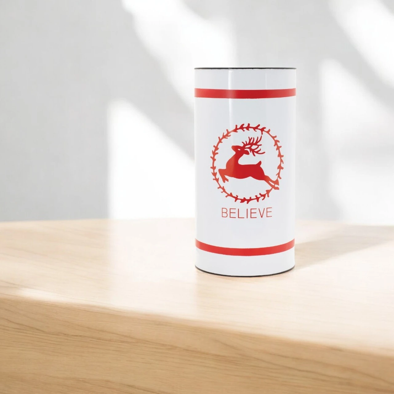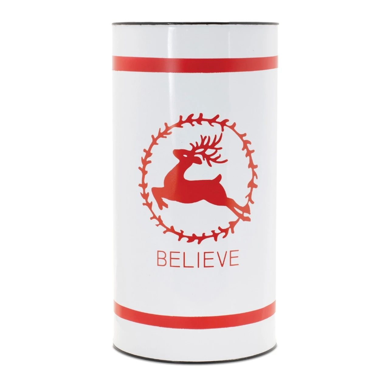 Spread holiday magic with this charming White “Believe” Holiday Container. Standing 14 inches tall and 8 inches in diameter, this iron container features a bold red reindeer design and the inspiring message “Believe.”