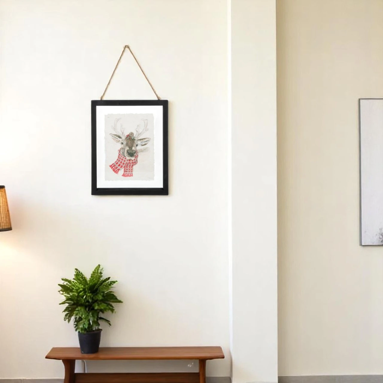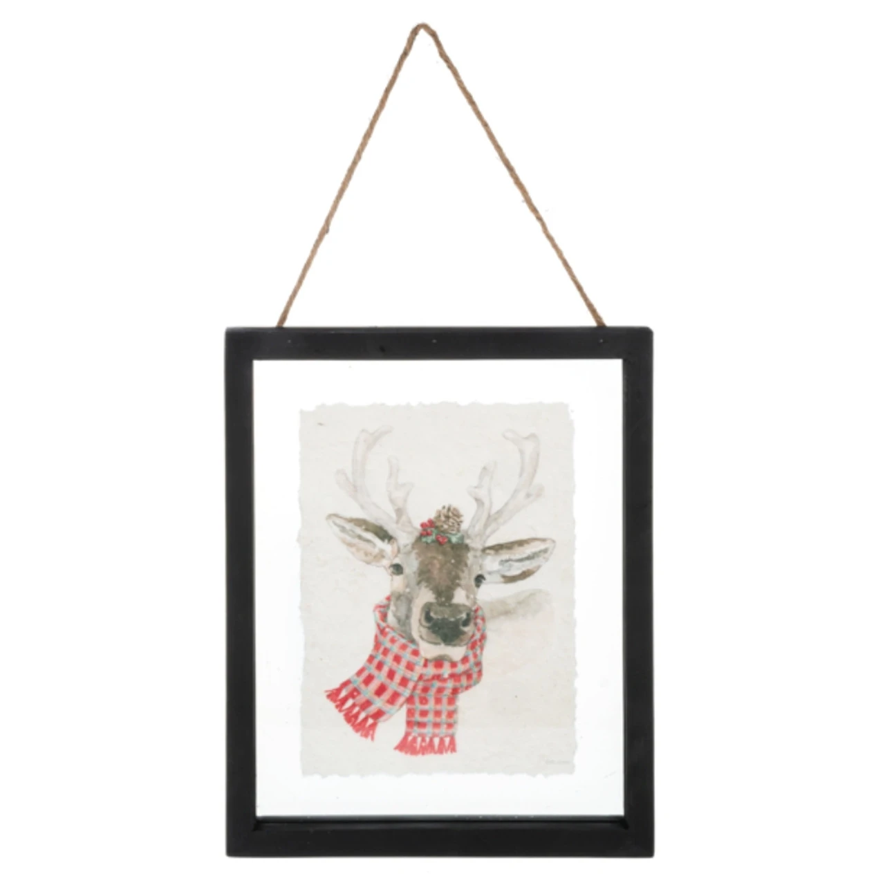 Capture the magic of a woodland winter with our Winter Woodland Deer in Frame. This charming deer, dressed up in a festive red plaid scarf, brings a rustic and cozy touch to your holiday décor.