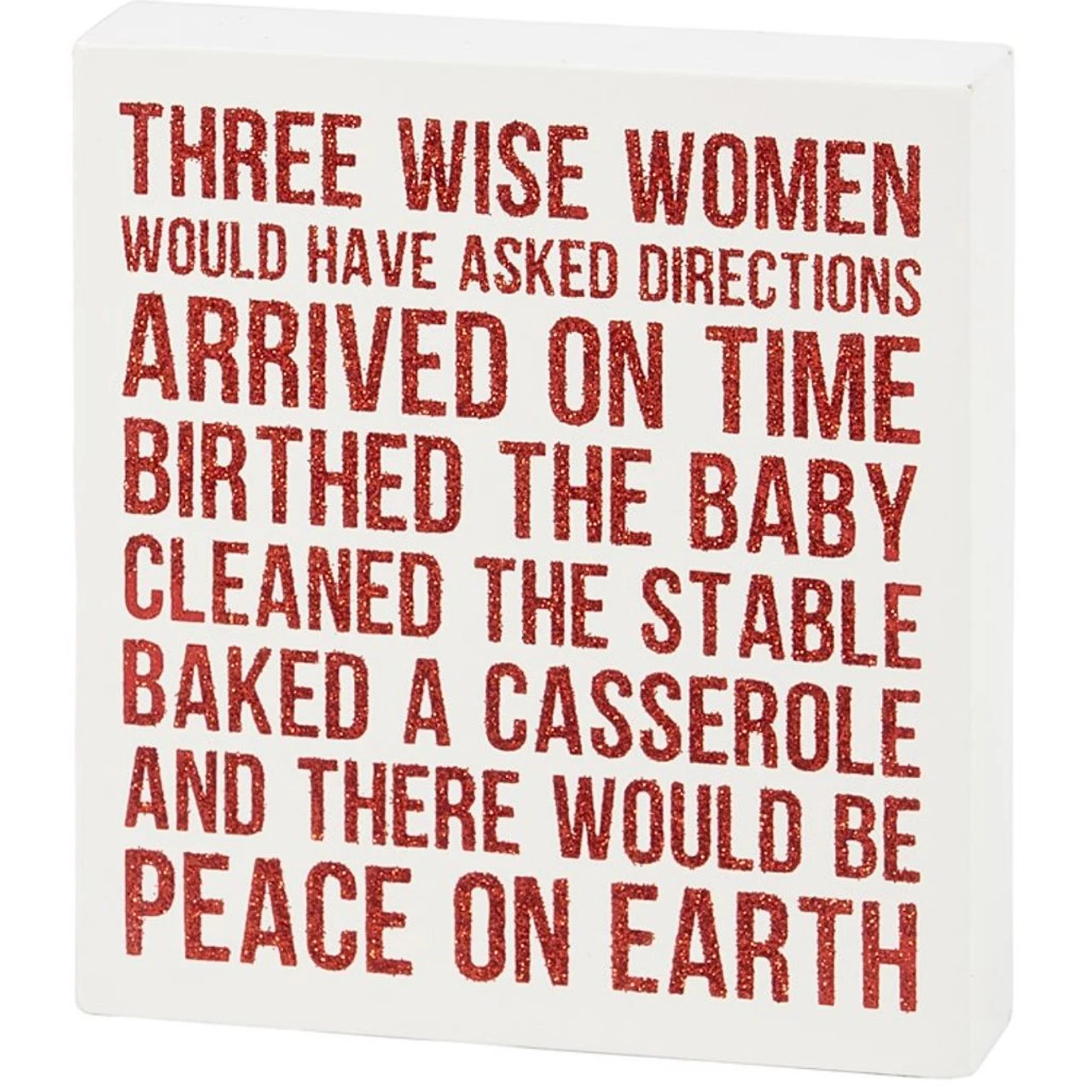 Celebrate the season with a touch of humor using this “Three Wise Women” block sign. Featuring glittery red letters on a white background, this witty decoration imagines how the nativity story might have gone differently with wise women.