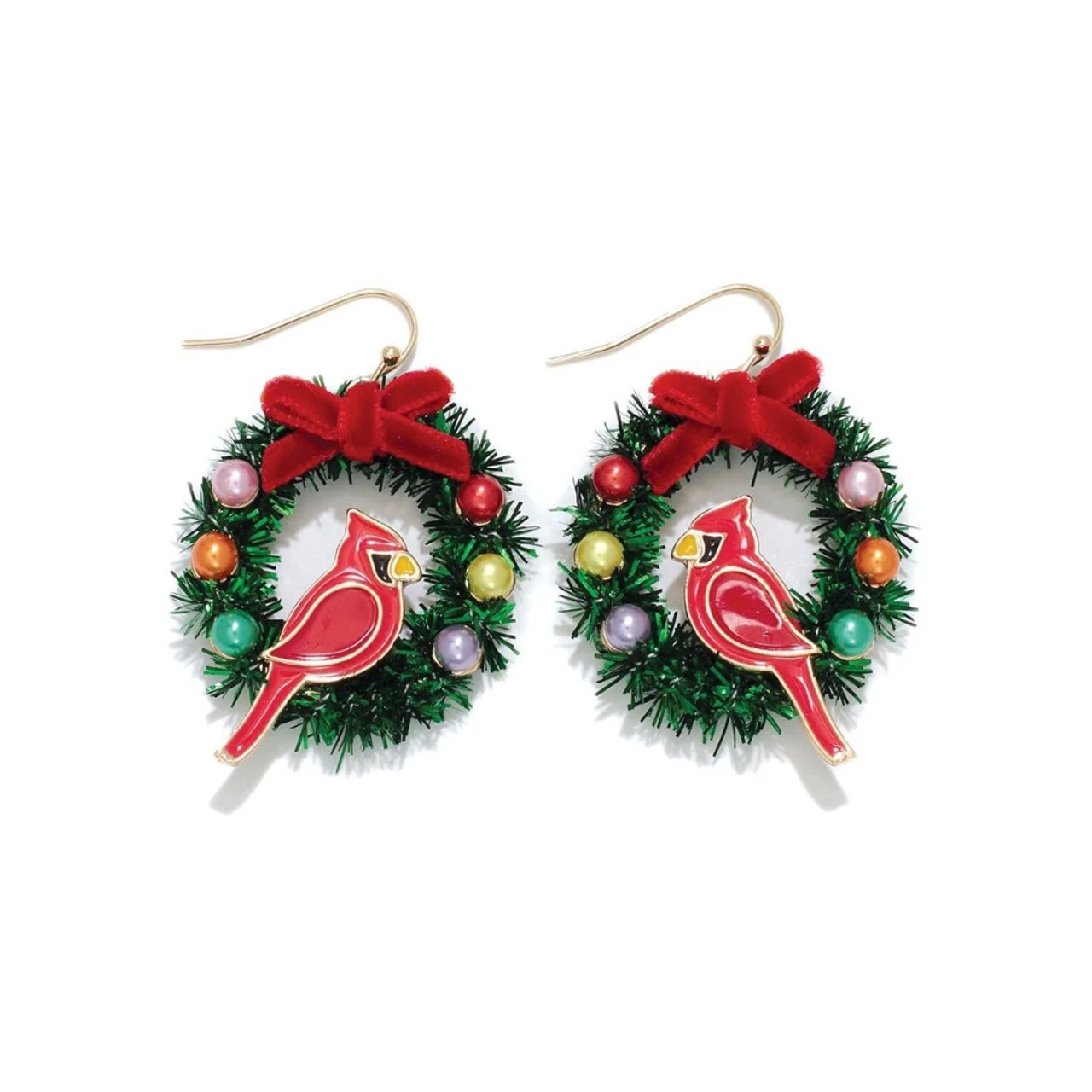 Celebrate the season with playful charm! These Periwinkle earrings feature mini wreaths made from sparkly green tinsel, dotted with multicolor ornaments, topped by a velvety red bow, and finished with a bright enamel cardinal perched proudly.