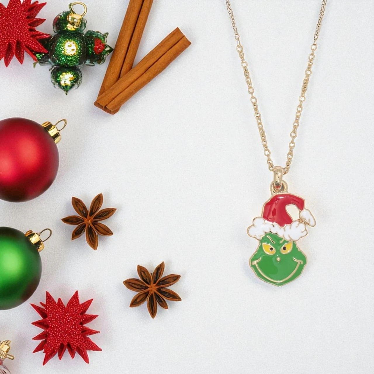 Show off your sassy holiday spirit with this “You’re A Mean One” necklace by Periwinkle. Featuring the unmistakable green grin and yellow eyes of a classic Christmas mischief-maker, the colorful enamel charm dangles from an 18″ gold-tone chain.